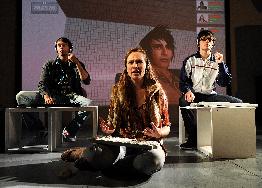 Das Zwei-Personen-Stück "No way out" feierte am Montagabend in der Black Box Uraufführung. Regisseurin Brigitta Gillessen und Theaterpädagogin Nina Fischer geben mit dem Stück als Gruppe acting up ihr Debüt. Ihr Ziel ist es, ein junges Publikum für das Theater zu begeistern. Mit Hip-Hop-Musik, schnellen Videosequenzen, authentischer Sprache und jungen Schauspielerinnen schaffen Gillessen und Fischer ein Stück, das den Nerv der Jugend trifft und pointiert die inszenierte mediale Wirklichkeit als Vorbild Jugendlicher in sozialen Brennpunkten in den Fokus stellt.